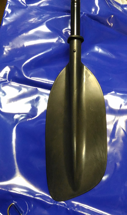Весло разбирается на 2 части и имеет два разворота лопасти. При сборке весла соединяются кнопочным фиксатором. Для изготовления лопастей весел используется высокопрочный полиэтилен. Размер лопасти - 19 х 47 см.