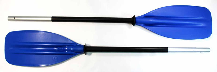 Весла разбираются на 2 части. При сборке весла соединяются кнопочным фиксатором. Для защиты от стекания воды у лопасти установлена ПВХ-манжета. Размер лопасти - 20 на 44 сантиметров.