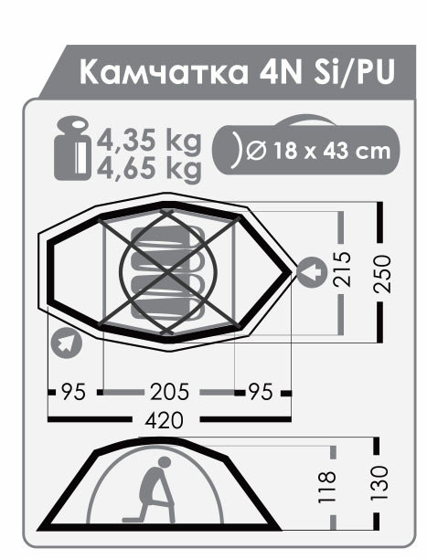 Масса палатки, кг (мин/макс): 4,35 / 4,65