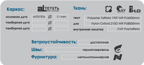 Особенности: Компактна, проста в установке. Один вход с тамбуром.система сквозной вентиляции. Внутреняя палатка имеет лаз в компактный замкнутый тамбур в задней части палатки.Защитные планки "молний" тента. Штормовые оттяжки. Антимоскитная сетка. Вентиляционное окно внутренней палатки закрывается клапаном на застежке "молния". Герметичное дно. Боковые и подвесной карманы-полки. Петля для фонарика на куполе палатки.