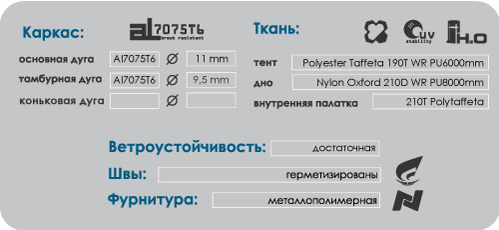 Система сквозной вентиляции. Вместительный основной тамбур с двумя входами. Дополнительный тамбур с одним входом. Защитные планки "молний" тента. Штормовые оттяжки. Антимоскитная сетка. Герметичное дно. Боковые и подвесной карманы-полки. Петля для фонарика во внутренней палатке и в тамбуре тента.