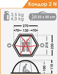 Габаритные размеры внутренней палатки, см (l x b x h) : 130 х 215 х 100