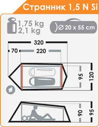 Особенности: Очень компактная, экстремально легкая и простая в установке палатка. // Двухслойная двухдуговая полубочка с подвесной внутренней палаткой. // Дуги каркаса имеют элементы заданной кривизны. // Конструкция данной модели позволяет использовать тент без внутренней палатки. // Удобный вход и вместительный тамбур. // Палатка оснащена системой купольной вентиляции. // Вентиляционное окно внутренней палатки закрывается клапаном на «молнии». // Боковые карманы из сетки. // Наружная ветрозащитная юбка по всему периметру тента. // Тент и дно внутренней палатки выполнены из современной ткани 40D Nylon 240T R/S silicone 4000 mm, которая отличается повышенной прочностью и заметно снижает массу палатки.