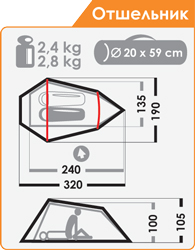 Габаритные размеры внутренней палатки, см (l x b x h) : 240 х 135 х 100