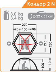 Особенности: Облегченная версия палатки Кондор 2N. Тент из легкой и прочной ткани 40D Nylon Taffeta R/S Si/PU с проклеенными швами. Легкая и компактная, простая в установке палатка. Облегченный тент из усиленной силиконизированной ткани с проклеенными швами.Двухслойная двухдуговая полусфера с коньком и независимой внутренней палаткой. Коньковая дуга увеличивает внутренний объём палатки. Два входа и тамбура. Палатка оснащена системой сквозной вентиляции. Боковые карманы из сетки. Стропа-фиксатор исключает соприкосновение внешнего тента с внутренней палаткой.