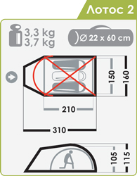 Габаритные размеры внутренней палатки, см (l x b x h) : 210 х 150 х 105