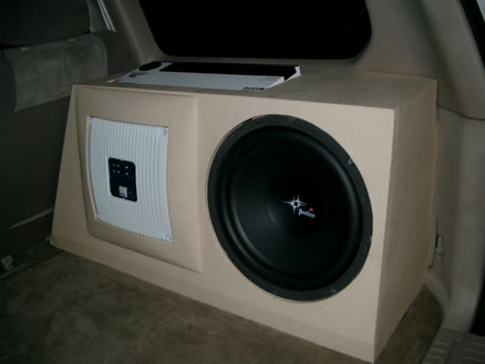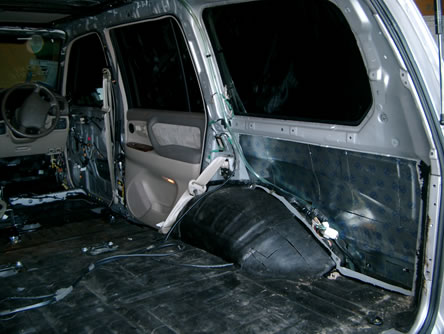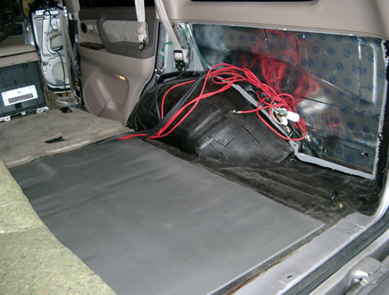 Сотый "Крузер", DVD-проигрыватель, подключённый к штатному головному устройству с телевизором, установка в штатные места, единственное исключение - стелс в правом крыле... В данном случае в нём хорошо ужились два мощных усилителя и 15" сабвуфер на динамике Peerless Resolution 15. Была проведена полная шумо/виброизоляция кузова автомобиля.Крыши...